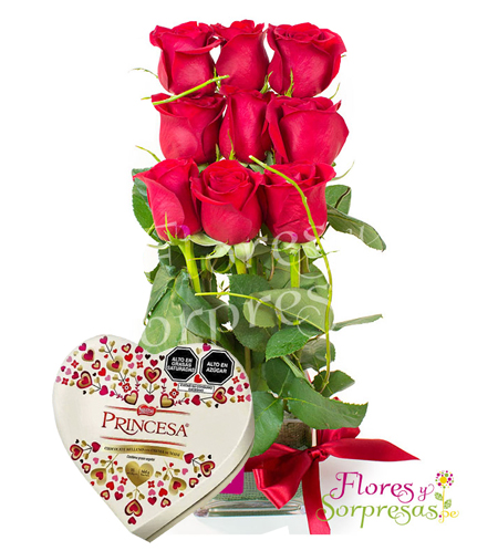 - Macetero de vidrio, 9 rosas rojas y follaje verde.