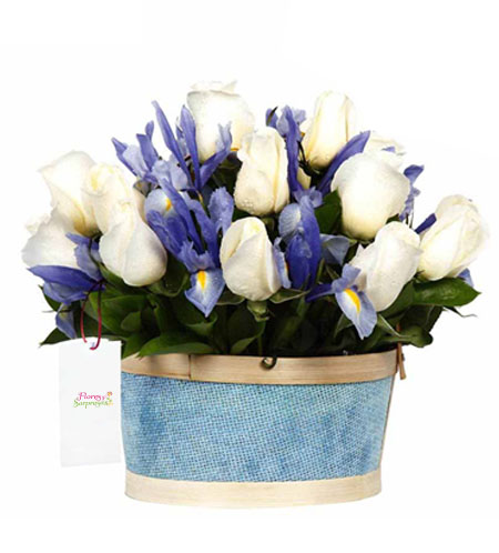 - 20 rosas, iris y follaje verde.