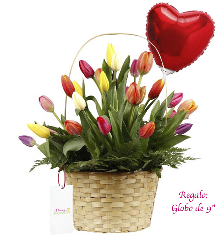- Canasta, 24 tulipanes, (los colores pueden variar según stock) y follaje verde.