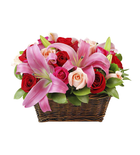 6 rosas rosadas claros, 6 rosas rosadas intenso, 6 rosas rojas, lilium y follaje verde.