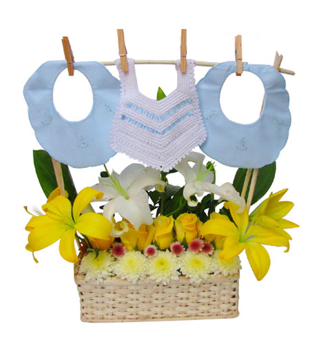 6 rosas, pompones, lilium, follaje verde y baberos.