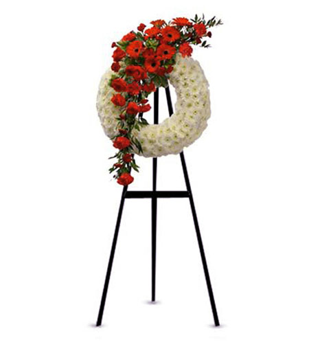 Delicada  Corona de Aro con Pompones naturales, Rosas y Gerberas rojas y follaje verde